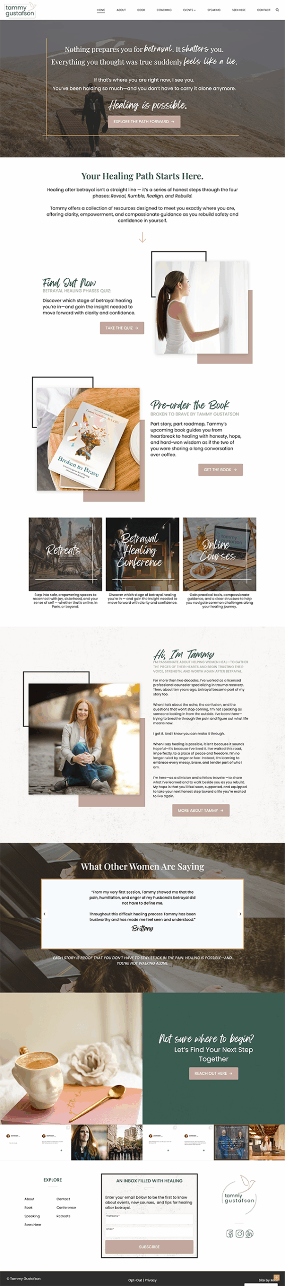 We have had the privilege of partnering with Tammy Gustafson—a speaker, author, and guide for women healing from betrayal trauma—several times over the last eight years. Tammy’s work is built on truth, not perfection, and her voice has become a steady anchor for women walking through some of the most painful chapters of their lives. With a growing platform, a new book release, and expanding programs, Tammy came to MRM this time with the desire to strengthen her personal brand and create an online home that reflects both her personal story and the brave path she leads others along.